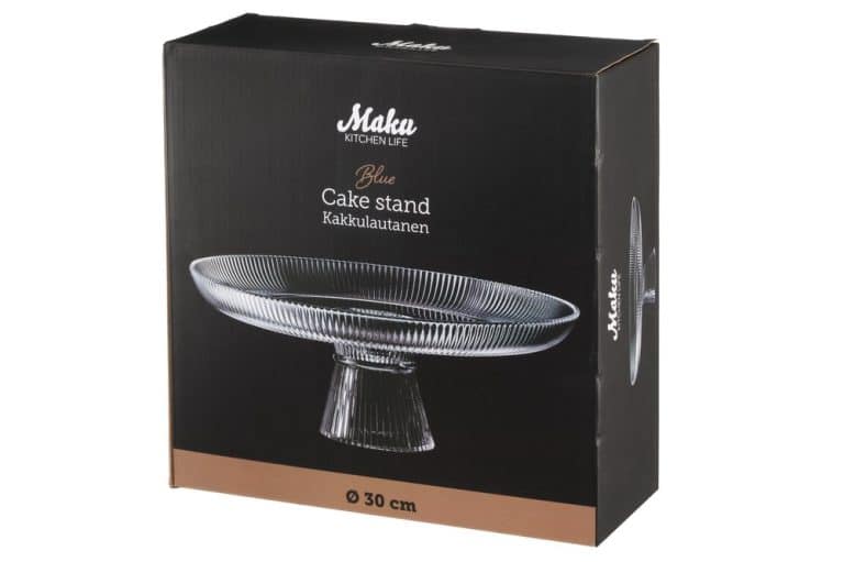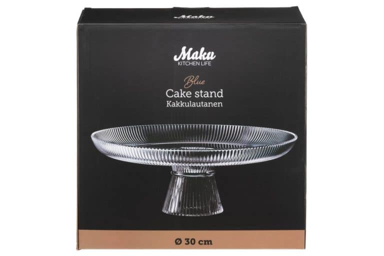 A stylish cake stand with a foot made of clear, beautifully grooved glass. Suitable for both everyday and festive table settings. Diameter 30 cm. Hand wash.