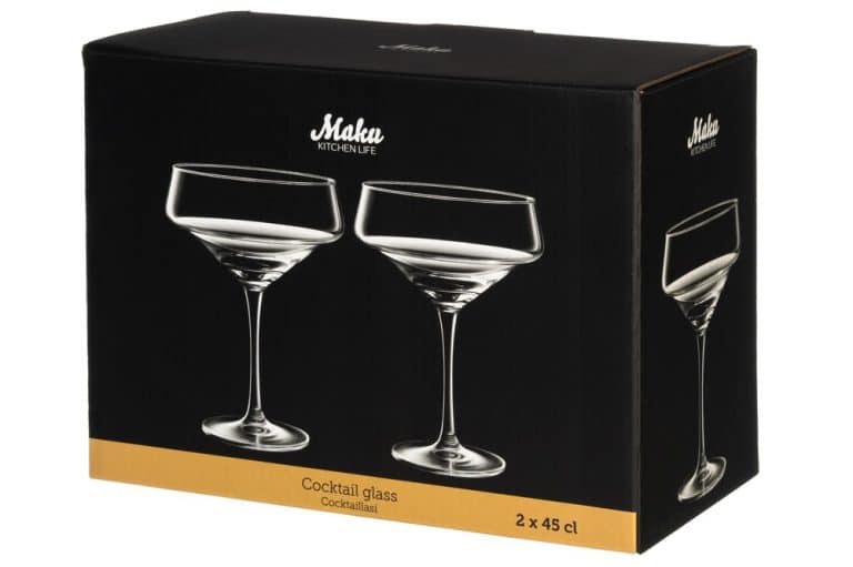 Elegant cocktail glass. The perfect glass for serving delicious mixed drinks and impressive desserts. 2 pieces per package. Capacity 45 cl. Dishwasher safe.