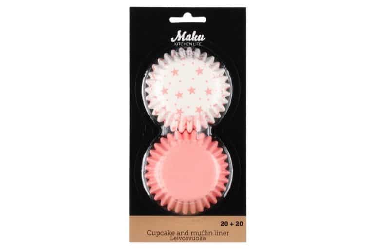 Maku cupcake liners bring a soft color to baked goods. Includes 20 pink and 20 star-patterned liners. Base diameter 5 cm. Suitable for muffins and cupcakes.