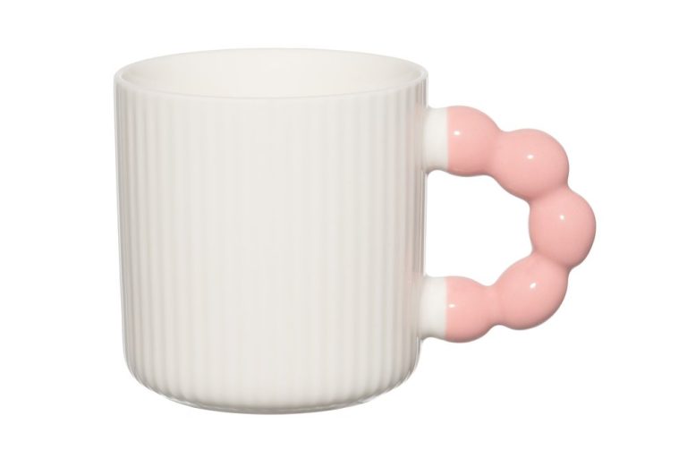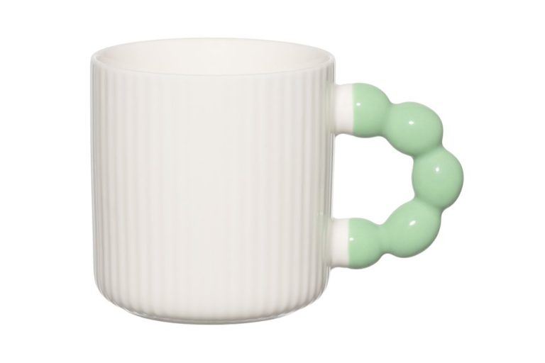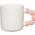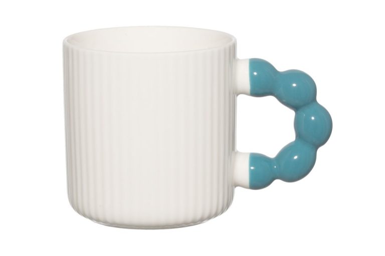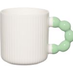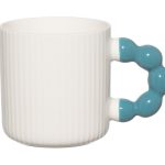 A characterful porcelain mug for everyday coffee and tea moments. The white mug features a playful, whimsically shaped colored handle that adds a cheerful touch. Capacity: 34 cl. Microwave and dishwasher safe.