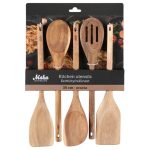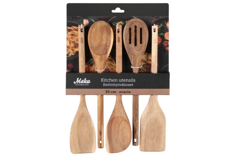 Kitchen utensils made from acacia wood do not scratch or damage pots and pans, especially non-stick coatings. This helps extend the lifespan of your cookware. Acacia wood has a beautiful, rich color and grain pattern that adds a touch of elegance to your kitchen. Extend the product’s lifespan by occasionally treating it with vegetable oil, which helps maintain the wood’s beautiful appearance and durability. Package contains: Angled spoon 30 cm, spoon 30 cm, slotted spoon 30 cm, turner 30 cm and scraper 30 cm. Hand wash.