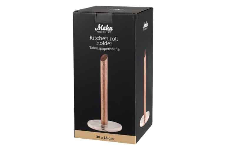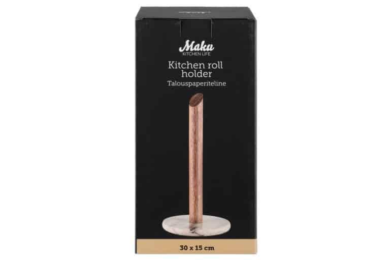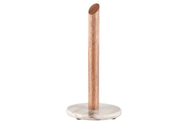 The paper holder has a brown marble base and an acacia wood paper roll holder. Marble is a natural material, so product-specific differences may occur. Cleaning with a damp cloth or hand wash with a mild detergent.
