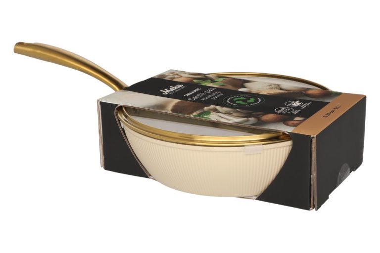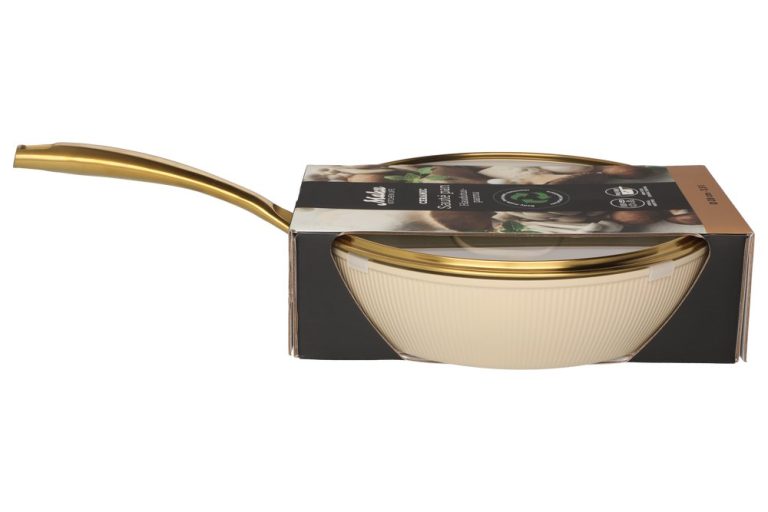 The beige sauté pan with a gold-colored handle is a perfect choice for your kitchen, combining elegance with practicality. The sturdy body is made of forged aluminum, ensuring excellent heat conductivity and durability. The ceramic non-stick Greblon coating makes cooking effortless and cleaning easy. The gold-colored, beautifully shaped handle adds a touch of luxury to your cooking experience. The sauté pan is suitable for all types of stovetops, so you can use it confidently on gas, electric, and induction. For best durability, we recommend hand washing.