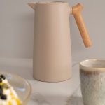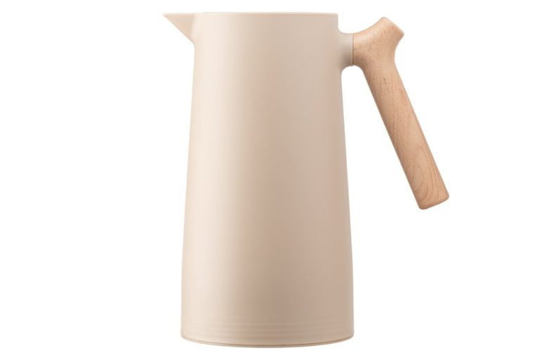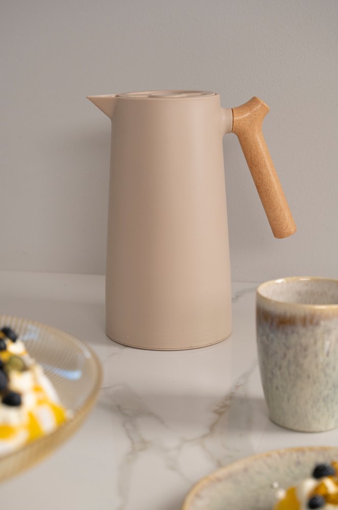 The stylishly designed beige thermos jug has a glass interior. The jug features a beautiful detail with a handle that imitates wood. Keeps the boiling beverage at 73 degrees for 6 hours. Capacity 1 L. Hand wash.