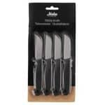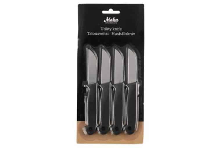 Short and sharp knives for example for cutting vegetables. Made of stainless steel. The package contains 4 knives. Length 16 cm. Dishwasher safe.