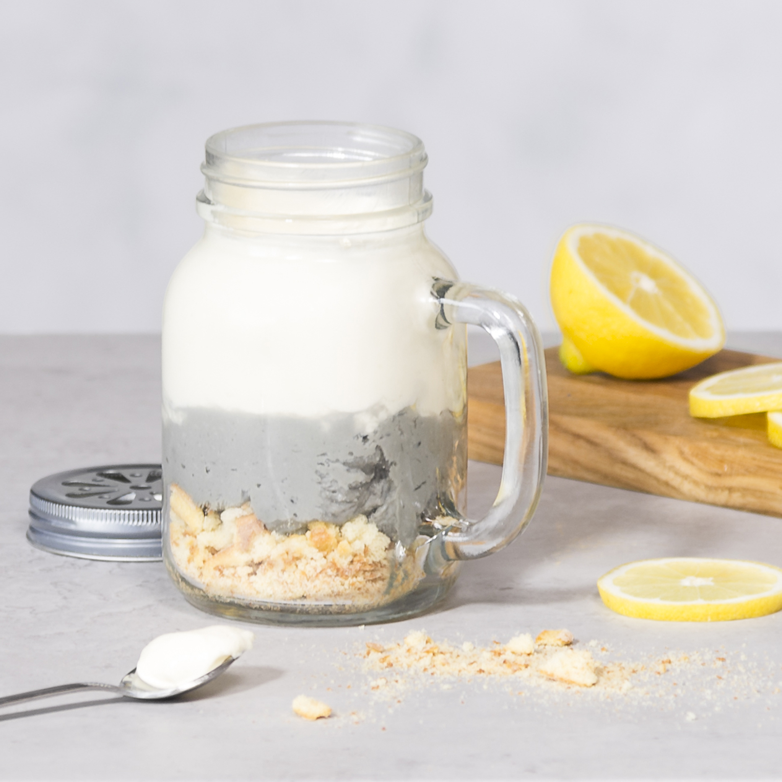 Kokoa lopuksi täytteiden tekeydyttyä jälkiruoka purkkiin kerroksittain, aloittaen keksimurskasta. Lopuksi voit koristella jälkiruoan fudgen paloilla.