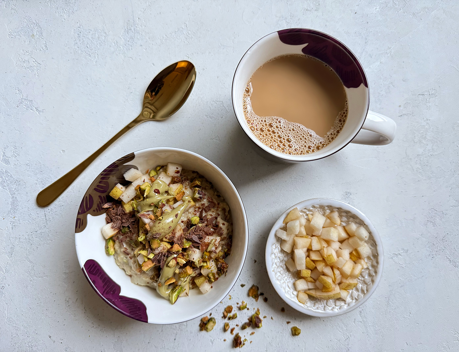 Jaa puuro kulhoihin. Lisää pinnalle päärynää, pistaasitahnaa, suklaarouhetta sekä karamellisoituja pistaasipähkinöitä.
