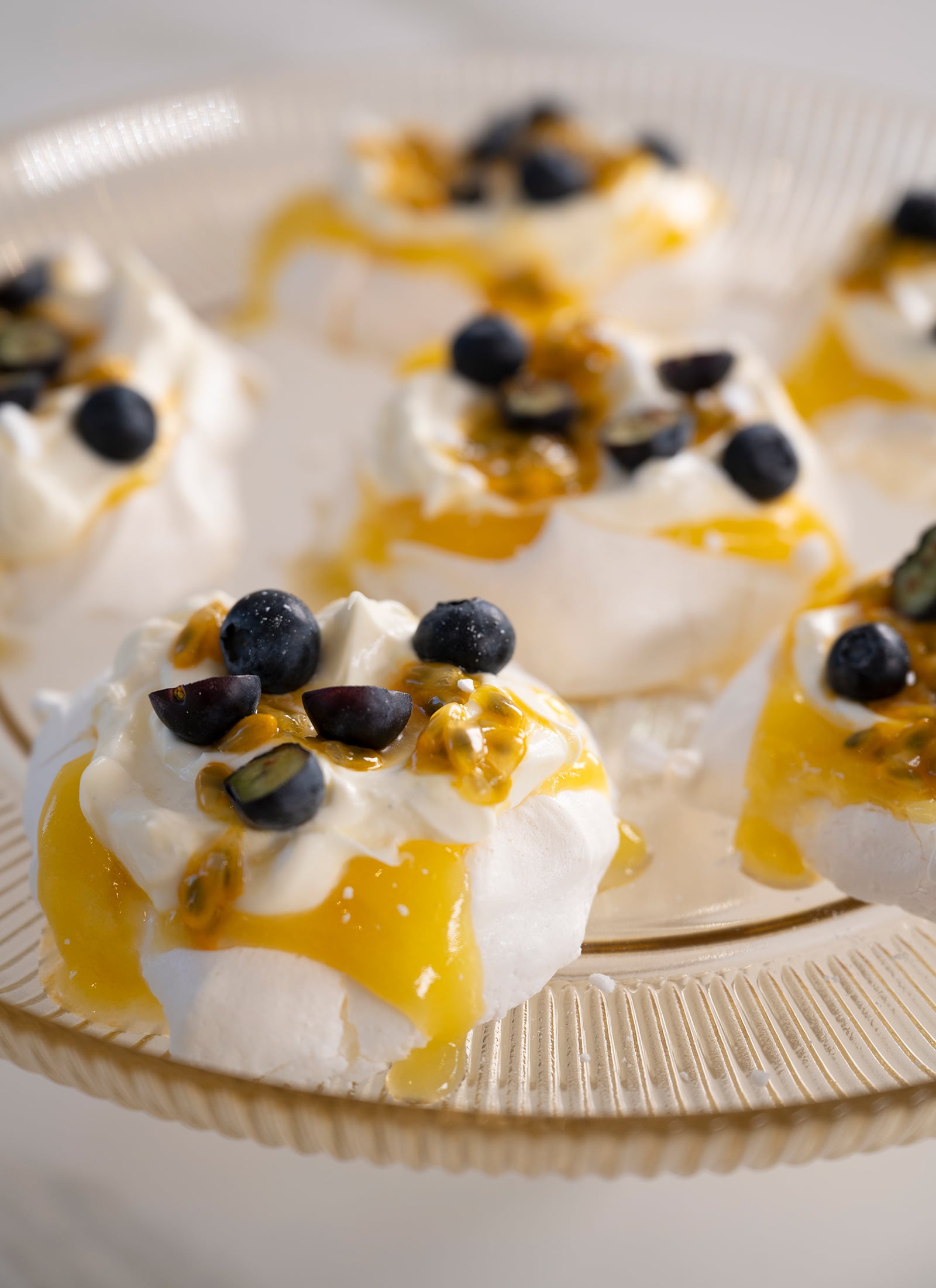 Valmista täyte. Mittaa kulhoon mascarpone ja kerma. Vaahdota. Sekoita joukkoon tomu- ja vaniljasokeri. Notkista sitruunatahna sitruunamehulla. Valuta sitruunatahnaseos marenkipohjille ja lusikoi päälle mascarponevaahtoa. Viimeistele passionhedelmällä, pensasmustikoilla ja marenkimurulla.