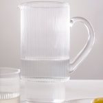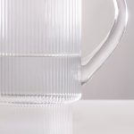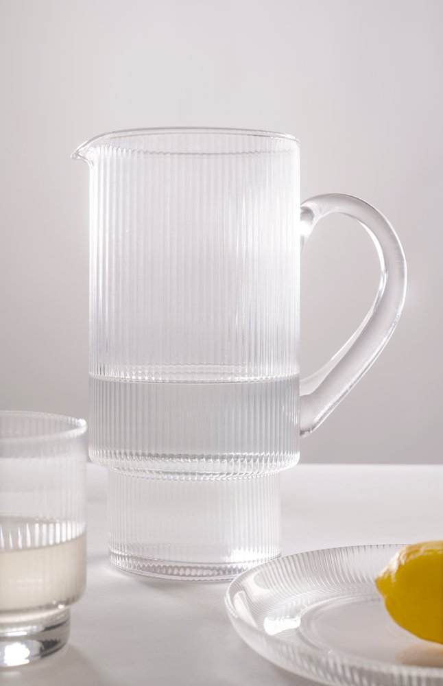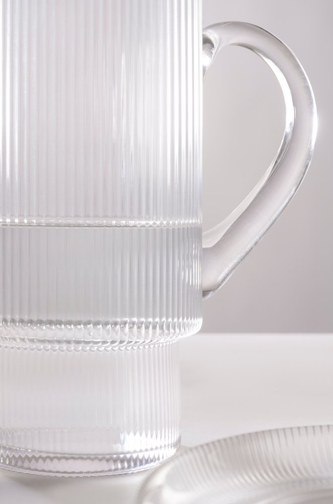 Tyylikäs juomakannu kirkasta, kauniisti uritettua lasia. Soveltuu niin arki- kuin juhlakattauksiin. Vetoisuus 1,4 L. Konepesun kestävä.