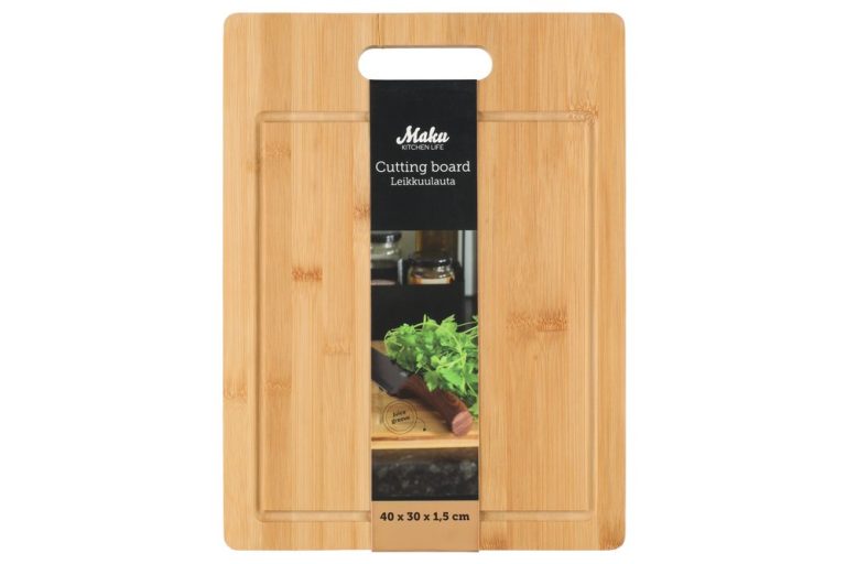 Kaunis bambusta valmistettu leikkuulauta on hellä veitsille ja antibakteerinen alusta ruoanlaitolle. Laudassa on nesteura. Käsinpesu.