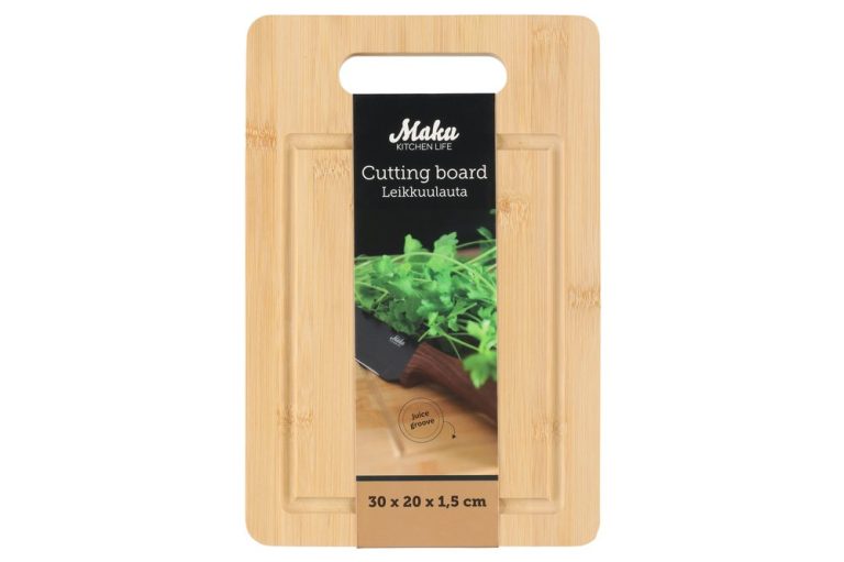 Kaunis bambusta valmistettu leikkuulauta on hellä veitsille ja antibakteerinen alusta ruoanlaitolle. Laudassa on nesteura. Käsinpesu.