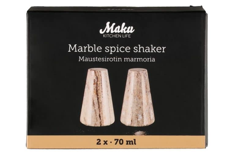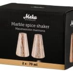 Kauniit marmoriset maustesirottimet suolalle ja pippurille. Vetoisuus 70 ml. Käsinpesu.
