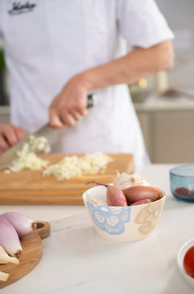 Hannele Kiviniemen suunnitteleman Sarka-kuosin juuret ovat kasvimaassa: luonnonläheiset värit, kasviaiheiset kuviot ja rohkea tussijälki antavat Sarka-sarjalle sen ainutlaatuisen ilmeen. Keraaminen Sarka-kulho Patula-kuosilla. Mikron, pakastamisen ja konepesun kestävä.
