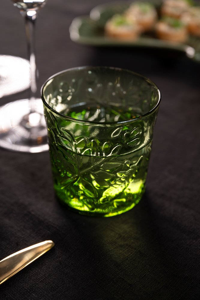 Kaunis puutarha-aiheinen kohokuvio. Läpivärjättyä lasia. Konepesun kestävä.