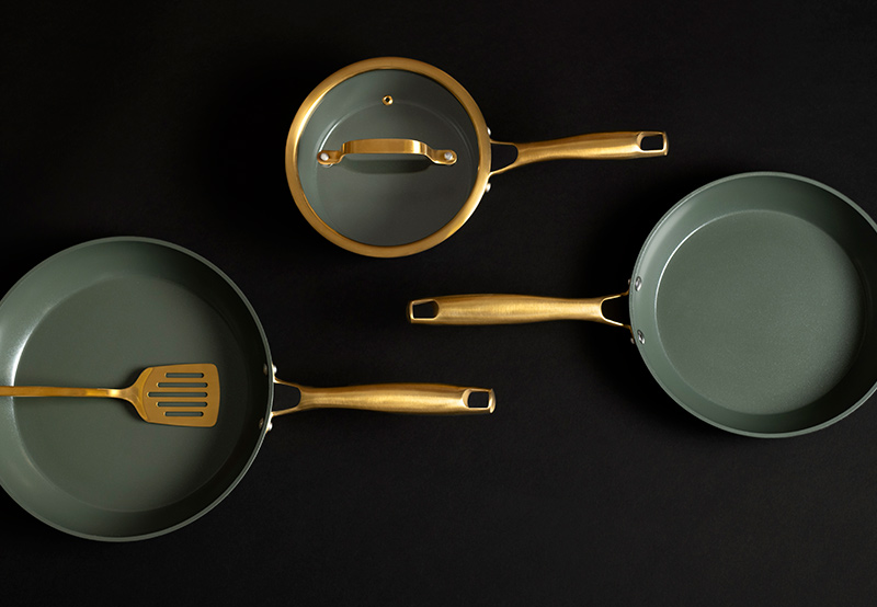 Upeat kullan ja vihreän värit, yylikkäästi uritettu ulkopinta, keraaminen Greblon-pinnoite ja taotun alumiinin tukeva runko tekevät näistä tuotteista yhtä aikaa kauniita ja käytännöllisiä. Täydellinen lahja niille, jotka arvostavat sekä tyyliä että toimivuutta.