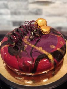 ”Tämä Mustaherukka Entremet kätkee sisäänsä ihanan rapsakan Manteli-daquoise pohjan. Sen päällä ihana maukas lakritsi-valkosuklaa kerros, jota ympäröi samettisen pehmeä valkosuklaamousse. Tätä kokonaisuutta ympäröi vielä veden kielelle saava kirpeä mustaherukkamousse. Kakun kruunaa kiiltävä Mustaherukka Glaze.